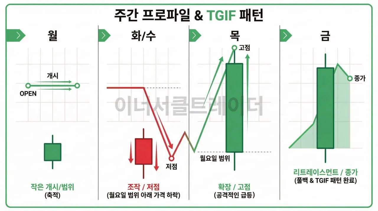 1. 이걸 모르고 매매하면 매수할 날에 팔고, 팔아아 할 날에 매수합니다 캔들은 우연이 아닌 세력들의 의도가 담긴 결과입니다 주봉 캔들을 하나하나 다 뜯어보겠습니다 . 2/ 주봉 해부학 월요일 : 주봉의 시가 형성 방향이 아닌 레인지를 만드는 날 화-수요일 : 시가 아래로 내려가 아랫꼬리를 만듭니다 (조작/함정) 목요일 : 강한 상승으로 몸통을 채운다 (확장) 금요일 : 고점을 찍고 약간 내려와 마감 (윗꼬리 / 마감) 이 흐름을 이해하는 것이 주간 프로파일의 핵심입니다 3/ 화요일의 법칙 통계적으로 주간 저점이 많이 형성되는 요일은 화요일(또는 수요일 런던 세션) 입니다 전략: 월요일에 형성된 저점 아래를 깨고 사람들 손절을 일으킴 (Manipulation) 즉, 화/수요일에 월요일 저점을 깨고 반등 할 때가 매수 타점으로 잡을 수 있는 것입니다 4/ TGIF 패턴 (Thank God It's Friday) 트레이더에게 금요일은 목표 달성 후 퇴근 날입니다 여기서 시나리오가 나뉘는데