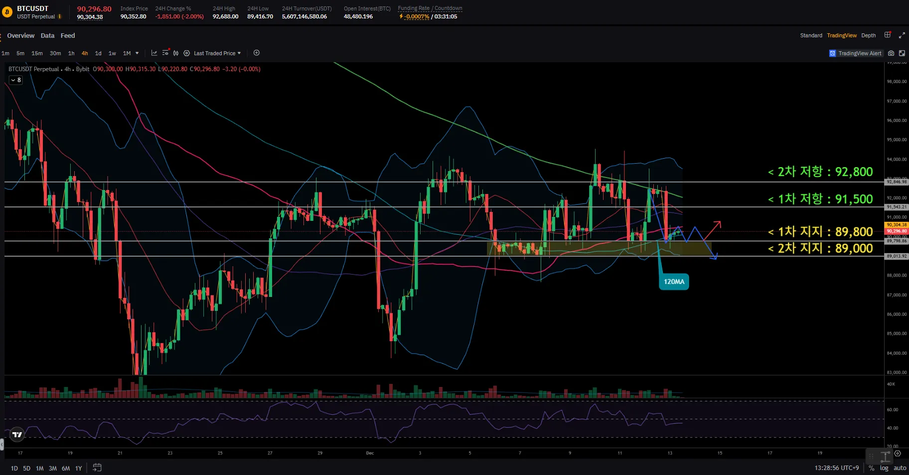 📌2025.12.13 차트 분석 ✔️ [시장 요약] • BTC : $90,000 • 시장분위기 : 하락 후 횡보 구간 • 계단식 하락 주의, 거래량 없는 움직임 ✔️ [기술적 분석] • 89.8K 마감 캔들 전저점 단기 지지라인 설정 • 89.8K 이탈 시, 전저점 이탈로 하락 N파동 확률 증가 • 2차 방어선으로 89.8K 이탈 시 89K에서 대응 • 단기 흐름은 120MA 흐름이지만 반등세가 적기 때문에 이탈할 확률이 높은 상황 • RSI 45, 아래로 꺽여있는 상황이라 하방 가능성 존재 ✔️ [주요 구간] • 1차 지지 - $89,800 • 2차 지지 - $89,000 - 1차 지지 마감 전저점 이탈 시 하락 N파동 확률이 높기 때문에 89K 분할 매수로 대응이 보수적 - 89~89.8K 단기 중요 매물대로 설정 • 1차 저항 - $91,500 • 2차 저항 - $92,800 - 91.5K 돌파 전까지는 횡보 관점 유지, 앞 장대음봉을 50% 장악하는 양봉들이 나와야 상단 200MA 저항 돌파 가능성 증가 - 현 시점, 저항 돌파를 기대하기 보단 하단 지지를 지켜주는지 체크하는 것이 더 중요 ✔️금일 매매에서