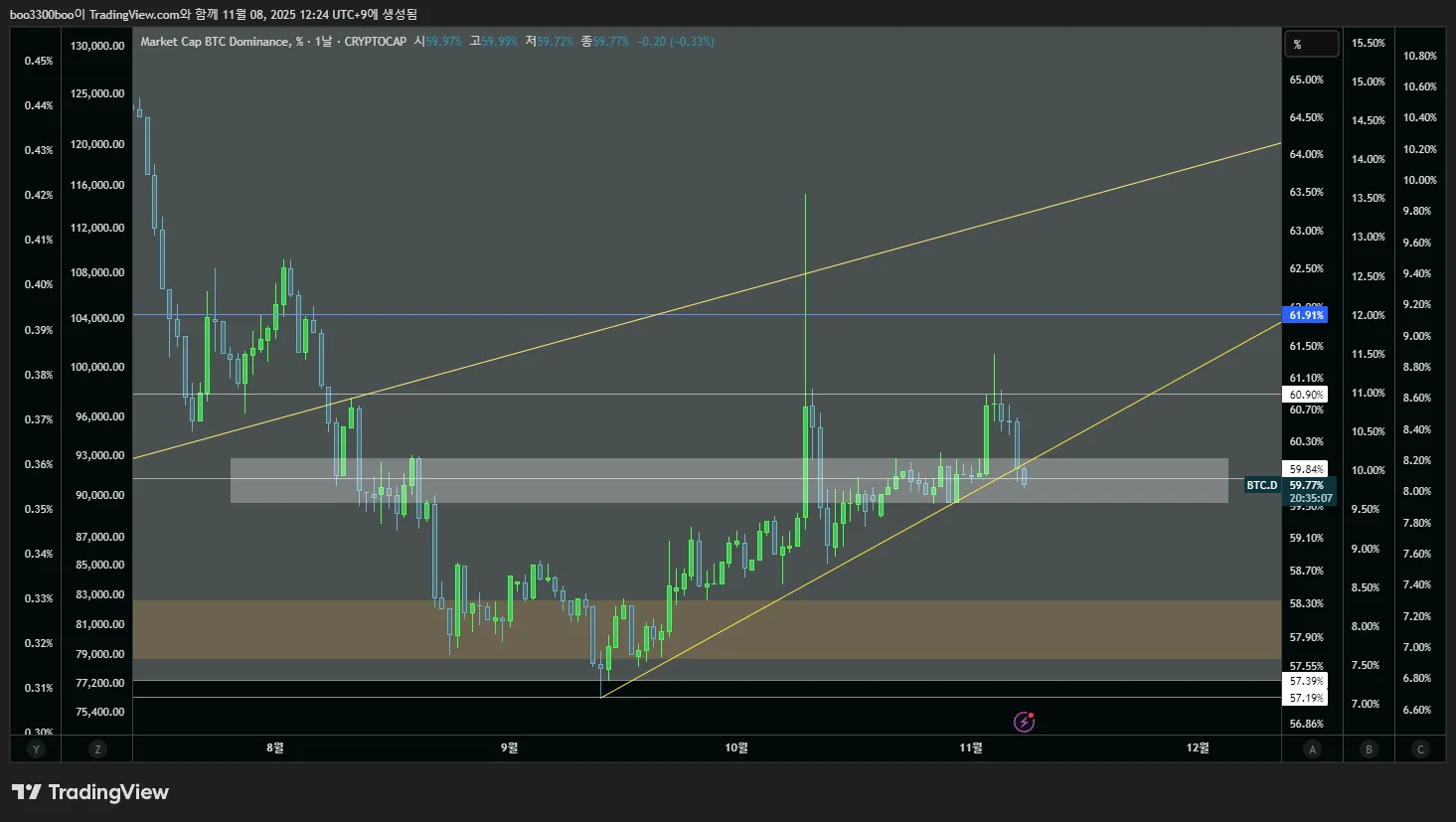 도미넌스 월봉을 보면, 과거 불장과 도미넌스 추세와의 관계를 알 수 있습니다. 수평적으로, 주황색 라인 71%부근에 도달하면 도미넌스와 비트코인은 거의 고점이었고 이후 알트불장 - 하락장 순으로 진행됐습니다. 대각선적으로, 주황색 하락추세선을 기준라인으로 보는 관점도 가능할 수 있습니다. 현재 도미넌스는 여름에 이번사이클 최고점을 찍었고, 주황색 대각선에 매우 근접했습니다. 터치가 안되었기때문에 확신할수는 없으나, 오차범위내 가까운 접근이라 낮은가능성으로 이미 최고사이클을 찍었을 가능성이 있습니다. 이 경우 비트코인은 하락장만 남겨놓고 있으며 이미 시즌은 종료된 상황이 됩니다. (전통방식인 수평선 관점 - 71% 지점까지 열어놓고 본다면, 상승장 마지막 상승파동이 남아있으며, 이 시기에 도미넌스는 71%지점까지 상승할 수 있습니다. 그 이후에나 알트불장과 하락장이 오게 될것입니다.) 흰색박스를 보면 고점터치 이후 내려와 있습니다. 이부분을 확대하면, 23년부터 이어진 긴 상승추세가 깨져있는 상황이며 주요 수평매물대에 걸려있는 상황입니다. 이마저도 깨질경우 곧 본격적으로 도미넌스가 하락하며 알트불장이 올 것이며,