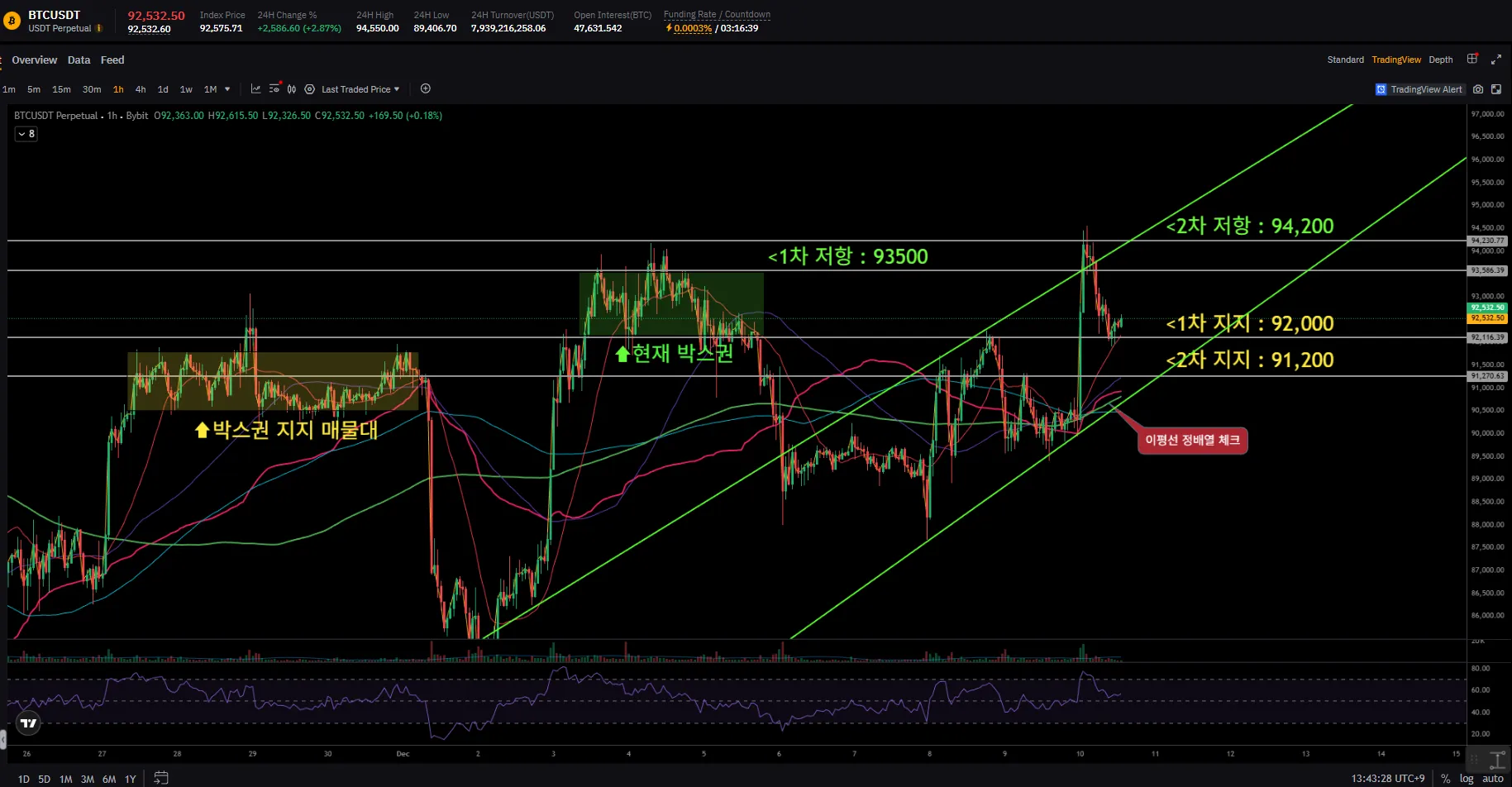 📌2025.12.10 차트 분석 ✔️ [시장 요약] • BTC : $92,500 • 시장분위기 : 추세 전환, 반등 후 조정 • FOMC 금리 결정, 단기 분기점,기업 비트코인 매수세 증가 ✔️ [기술적 분석] • 1차 지지 92K 20MA 단기 흐름만 체크 • 92K 이탈할 경우 단기 하방으로 91.2K까지 열리며 분할 매수 가능 구간 • 92~93.5K 현재 박스권 움직임으로 체크 • 90.4~91.8K 과거 박스권 지지 매물대 설정 • 반등이 강한 만큼 그에 따른 조정이 나온 상황으로 조정 후 횡보세 확률 증가 • 포지션 진입 시, 유지 기간이 길어질 수 있기 때문에 분할 매수 접근 ✔️ [주요 구간] • 1차 지지 - $92,000 • 2차 지지 - $91,200 - 단기 흐름으로 손절 짧게 접근하기 좋은 자리는 92K로 설정 92K에서 분할 매수 후 2차 지지에서도 대응 가능 구간 - 91.2K + 하단 장기 이평선 구간에서는 손익비 자리로 유리한 평단 • 1차 저항 - $93,500 • 2차 저항 - $94,200 - 93.5K 과거 박스권 상단으로 단기 저항 설정(재돌파시 상승 관점 증가, 이전까지는 강