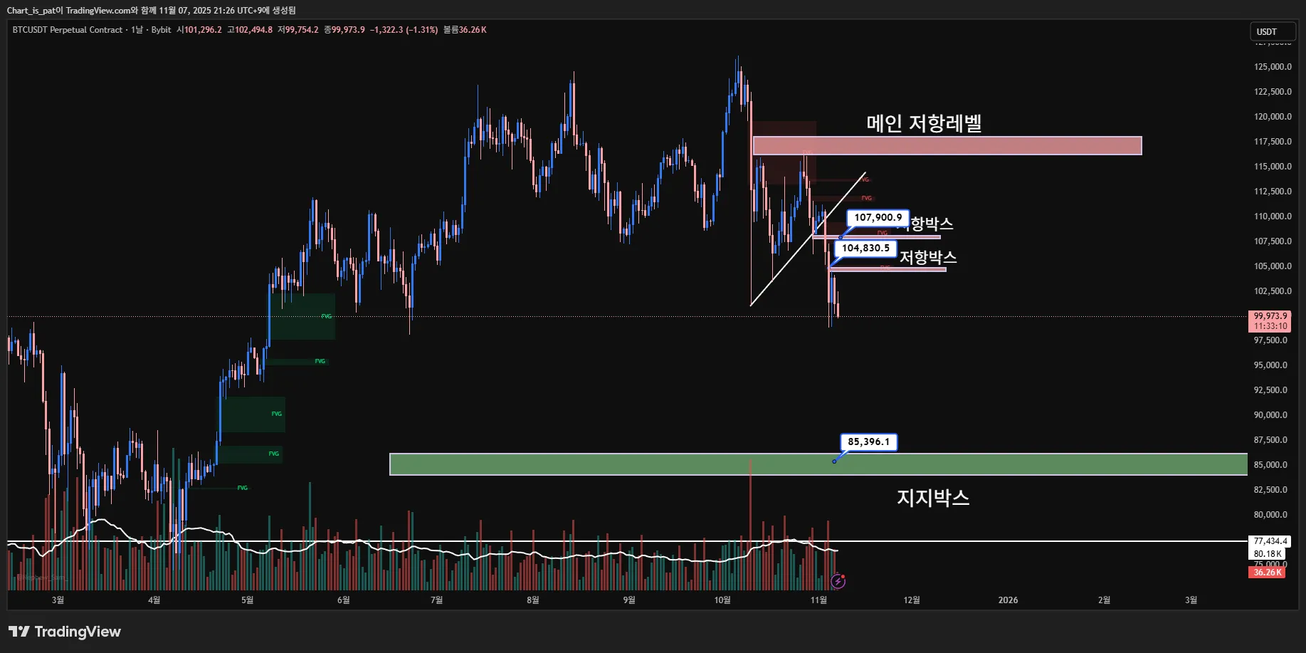 안녕하세요 차트는패트입니다. 먼저 저를 소개드리자면 패트는 스윙트레이딩에 관점으로 작도를 하여 매매를 하는 트레이더 입니다. 최대한 쓸데없는 구간은 배제하고 이해하기 쉽게 보실수 있도록 글을 올려보겠습니다. 먼저 비트코인 차트 일봉입니다. 메인 저항레벨인 112k를 넘지못하고 현재 100k가 붕괴된 비트코인입니다. 앞으로 어디까지 갈 것 같냐고요? 정확하게 말씀드리자면 긴 관점에서는 86k 부근 지지라인을 터치해줘야 유의미한 반등이 나온다고 보고있습니다. 이유1 현재 비트코인은 반감기 사이클의 막바지에 놓여있습니다. 전 21-22년 불장이였을때 다들 기억하시나요? 비트코인 1억간다. 17년도 불장이랑 이번에는 다르다가 대부분 개미들의 생각이었습니다. 그 결과, 어떻게 됐을까요? 물량을 털 자리도 주지않고 3-40% 폭락했습니다. 과연 이번에는 다른게 맞을까요? 이유2 상승거래량, 즉 모멘텀이 식어버렸습니다. 사진에서 보시면 아시겠지만 상승추세로 오를때마다 점점 매수거래량이 식는반면. 하락조정을 주었을 때 점점 하락거래량이 대량으로 터진다는 점입니다. 그렇게 거래량이 점점 수렴하다가 10/10 트럼프 대통령의 관련