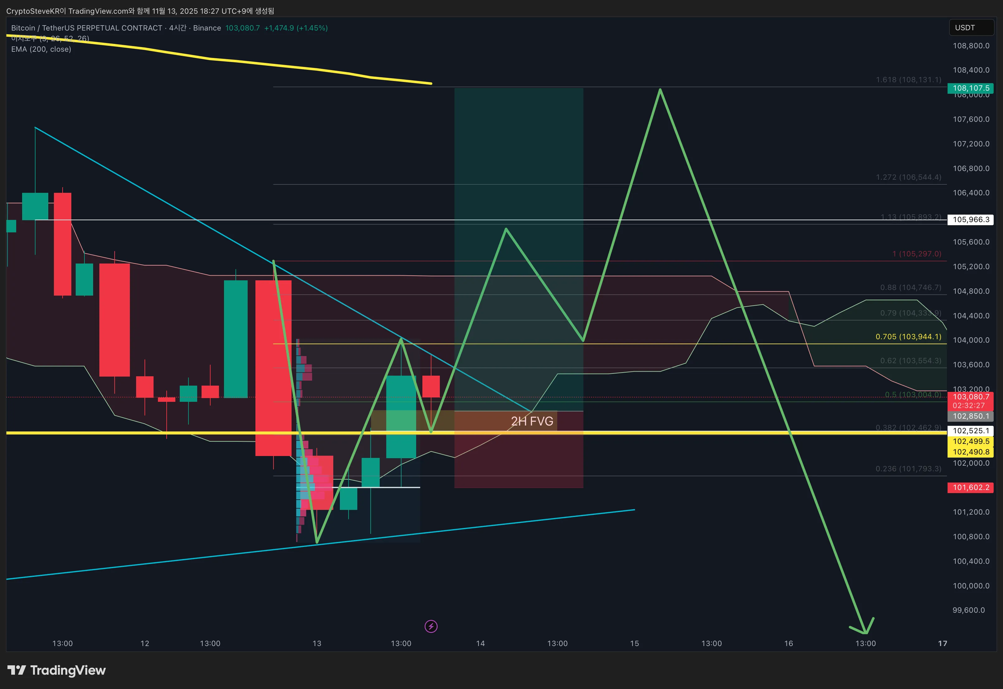 안녕하세요 Trader Steve 입니다. $BTC 가격은 밤새 강하게 하락해서 101.3k의 기존 저점 을 돌파, 100.7k를 찍고 강하게 반등하면서 SFP 구조 를 완성. Weekly Low 라인을 스윕 해주면서 유동성을 충전하고 올라가면서 반나절만에 순식간에 약 3천불을 올려놓았습니다. 새벽에 밤을 새며 좋은 롱포지션 엔트리를 찾기위해 고생한 덕분에 101.6k 라인에 롱포지션을 구축할 수 있었지만 102.4k에서 익절로스 컷 당하고 아쉬운 마음을 달래며 상승을 지켜보았습니다. 11월 13일 오후 5시 이후 과매수에 대한 수익 실현 매물로 가격의 되돌림이 진행되었고 그 결과 102.5k를 밟아줬는데, 이 부분이 2시간봉 기준 FVG을 다 채우고 기존 MSS 라인의 지지를 받아낸 자리입니다. 유의미한 지지를 받고 $BTC 가격은 재차 상승세를 이어가는 중. 101k에서 104k 까지 약 3천불을 올려놓는 상승을 보고, 달리는 말에 올라 탔다면 반드시 흔들릴수 밖에 없는 무빙입니다. 언제나 달리는 말에 올라타기 보다는 구조적 MSS 라인을 찾아서 그 자리까지 되돌림이 오기를 기다리는 것 이 좋습니다. 그 이유는 명확한 SL 라인과 TP
