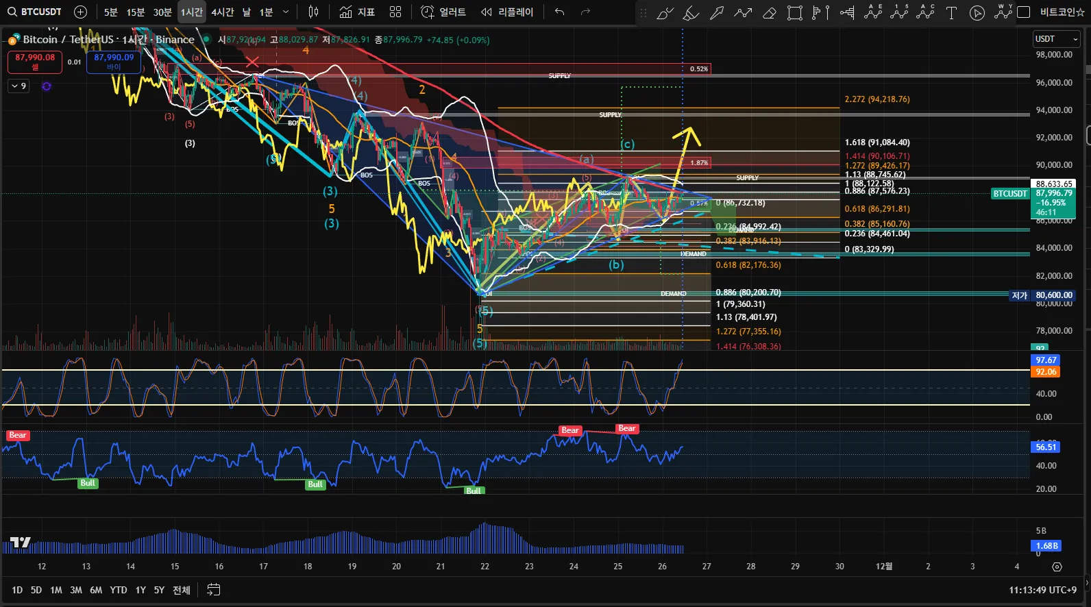 ✅ 비트코인 11월 26일 ( 저는 이제 상승을 봅니다. ) 수렴 끝단 비트코인 1시간 차트는 현재 중단기 기준 하락 5파 구조가 완료된 이후의 중기 상승파동의 움직임으로 체크가 가능합니다. 전일 되돌림 하락을 체크하였고 , 86k 초반까지의 하락이 발생한 이후 다시금 상승의 모습을 이루며 수렴의 마지막 지점을 양봉 캔들로 채워 나가고 있는 비트코인입니다. 이런 상황에서 아직 레깅스팬(노란색 선)은 캔들 위에서 움직이며 RSI의 하락다이버전스를 소화하며 스토 RSI도 과매수권을 식혀가고 있습니다. 삼각수렴의 상단을 돌파한다면 최소 3K의 가까운 반등은 나와줄 것으로 예상되며 급격한 매수세가 유입된다면 200일선(빨간색)의 지지가 재차 발생해주는지 체크가 필요하다고 보여집니다. 일목구름의 음운의 양운의 영역에 접어들며 수렴부 끝단을 향해 가고있는 비트코인 【 저의 예상대로 반등이 나와주기를 고대해보겠습니다. 】 텔레그램 채널 : https://t.me/Crypto00foodies
